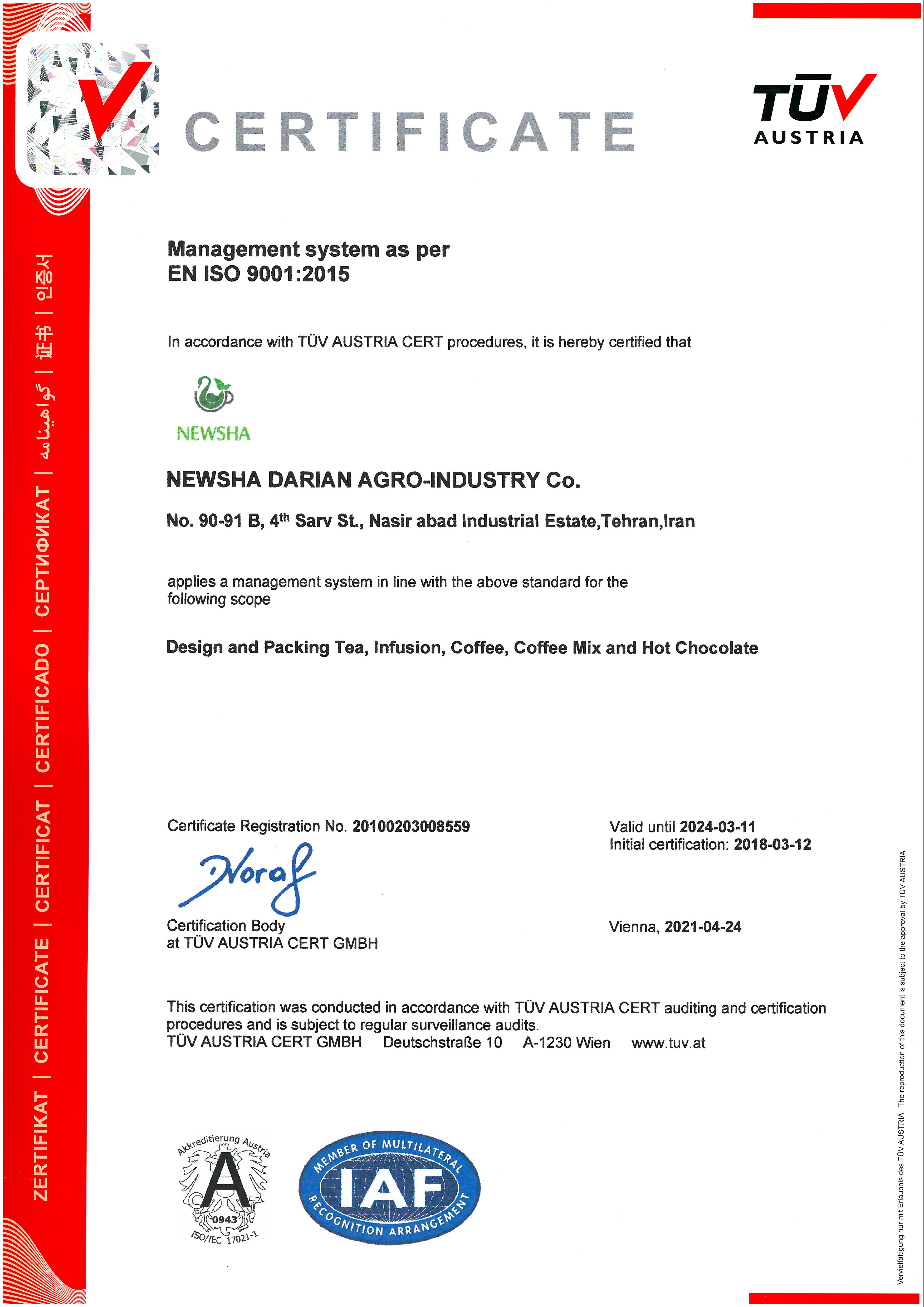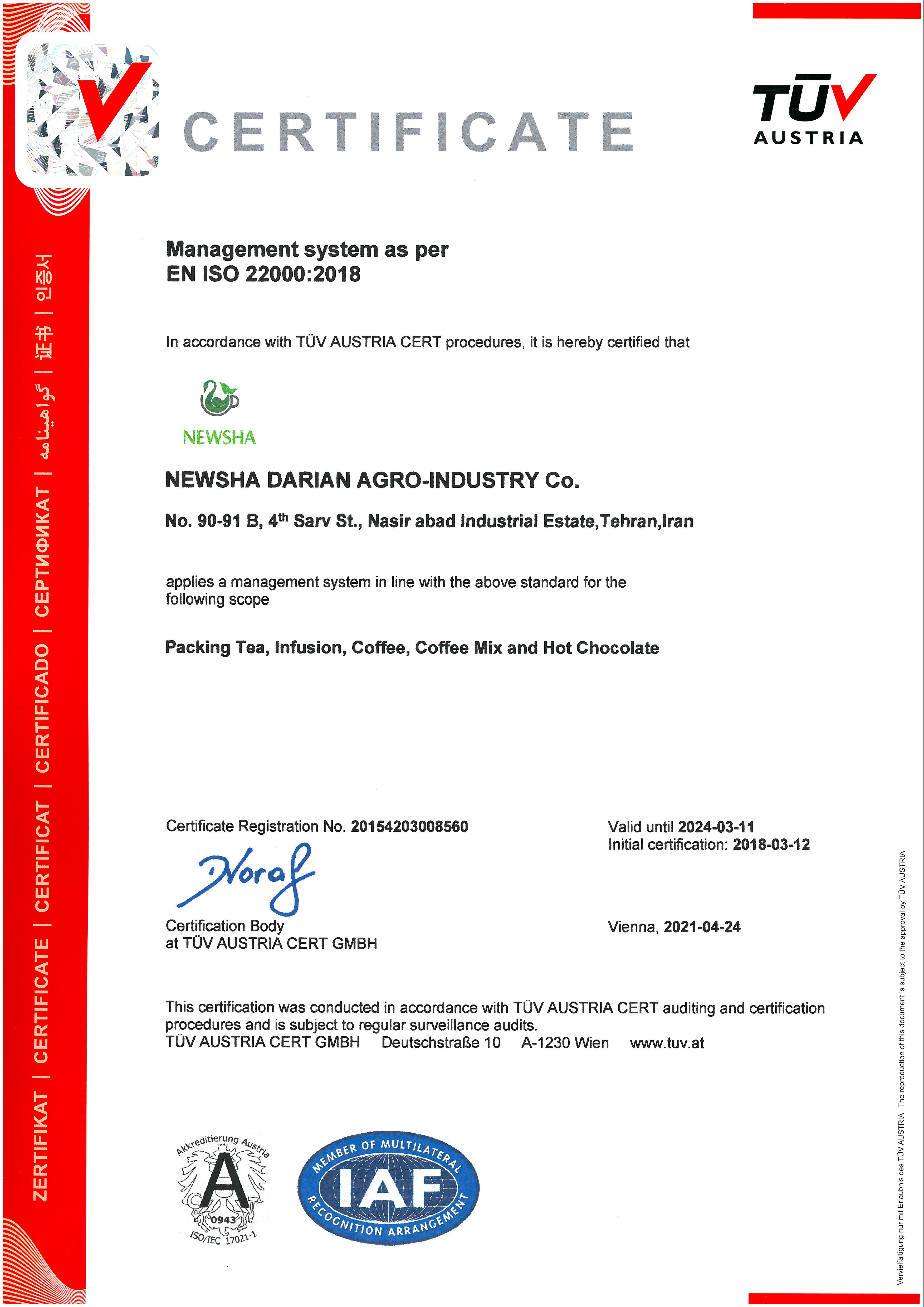 Newsha achieved ISO 9001, ISO 22000, and HACCP certifications.